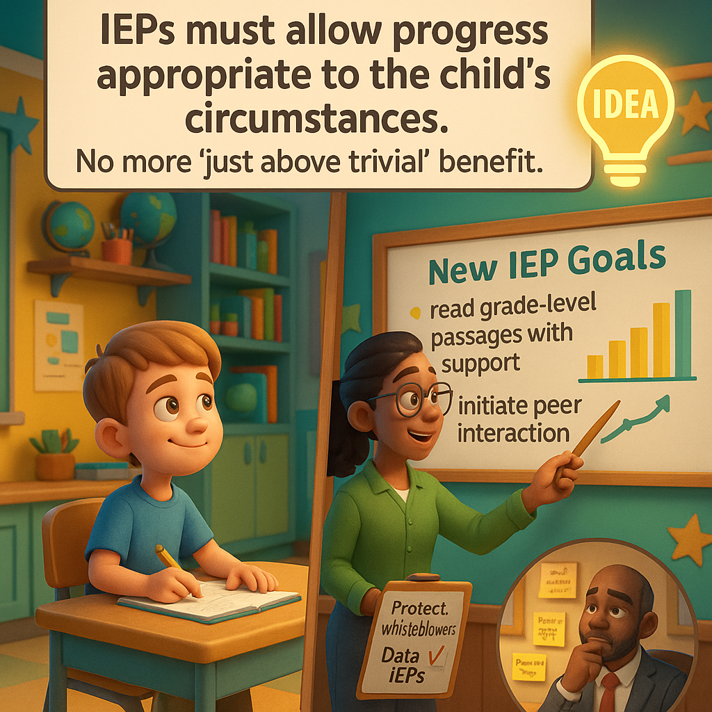 Endrew F. v. Douglas County School District RE-1, 580 U.S. ___ (2017), does something similar for IDEA but with the volume turned way up. Endrew, a student with autism, received IEPs that looked the same year after year, and his parents believed his progress had basically stalled. They placed him in a private school where he made significant gains and then sought tuition reimbursement under IDEA. Supreme Court The central legal issue was: what does FAPE really require? Is “merely more than de minimis” educational benefit enough, or must schools provide something more substantive? The Court rejected the “barely above trivial” standard and held that an IEP must be “reasonably calculated to enable a child to make progress appropriate in light of the child’s circumstances,” with an expectation of “challenging objectives.” Justia Law+2Supreme Court+2 The rationale fits neatly with Bradley’s and Schimmel’s framing: IDEA isn’t a paperwork statute, it is an equity statute. You cannot comply by recycling last year’s IEP with cosmetic edits; the plan has to be individualized, ambitious, and responsive to actual data on the child’s growth.