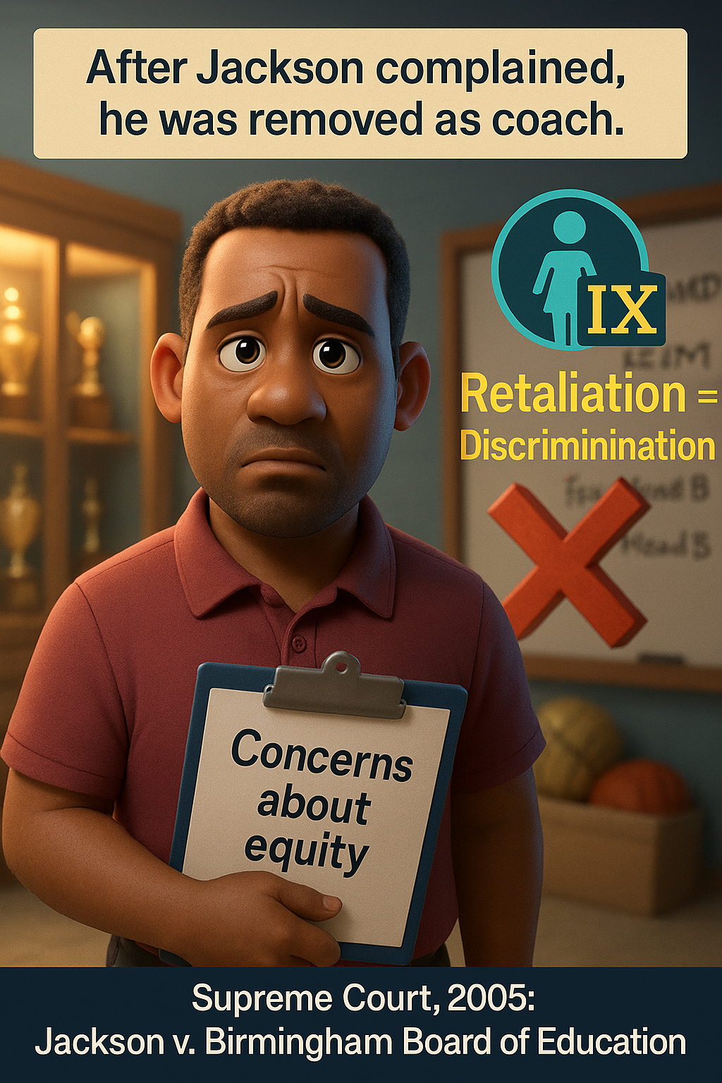 Jackson v. Birmingham Board of Education, 544 U.S. 167 (2005), is the Title IX wake-up call for every K–12 administrator who thinks retaliation is a side issue. The case centers on Roderick Jackson, a high school girls’ basketball coach who complained that his team was treated worse than the boys’ team. After he raised concerns, he was removed from his coaching position and sued, claiming unlawful retaliation under Title IX. The legal issue was narrow but huge: does Title IX’s implied private right of action cover retaliation against someone who complains about sex discrimination? The Court’s holding was yes, retaliation against a person because they complained of sex discrimination is itself intentional sex discrimination under Title IX. The rationale tracks the logic we now teach in school law courses: if you let districts retaliate against whistleblowers, you destroy the enforcement mechanism and gut the statute’s purpose. In a K–12 building, that translates to very practical guardrails: if a teacher reports inequitable funding, locker-room access, or harassment of female or LGBTQ+ students, district leaders cannot quietly punish them by reassigning, isolating, or freezing them out. Jackson doesn’t invent new law so much as make the anti-retaliation principle explicit, and that clarity adds complexity to our HR and supervision practices while staying faithful to Title IX’s core equity mission.